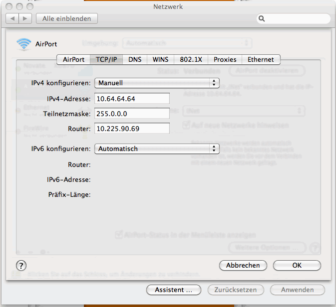 ist 10.64.64.64, also die IP Adresse vom Airport. Als DNS trägt man die