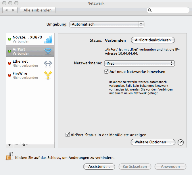 Wenn man schon eine UMTS Karte oder Stick für das Laptop hat, wäre es natürlich schön, wenn man diesen Internetzugang mitnutzen kann, z.B. wenn man unterwegs ist oder DSL mal ausgefallen ist. Internet-Sharing in OSX macht’s möglich.